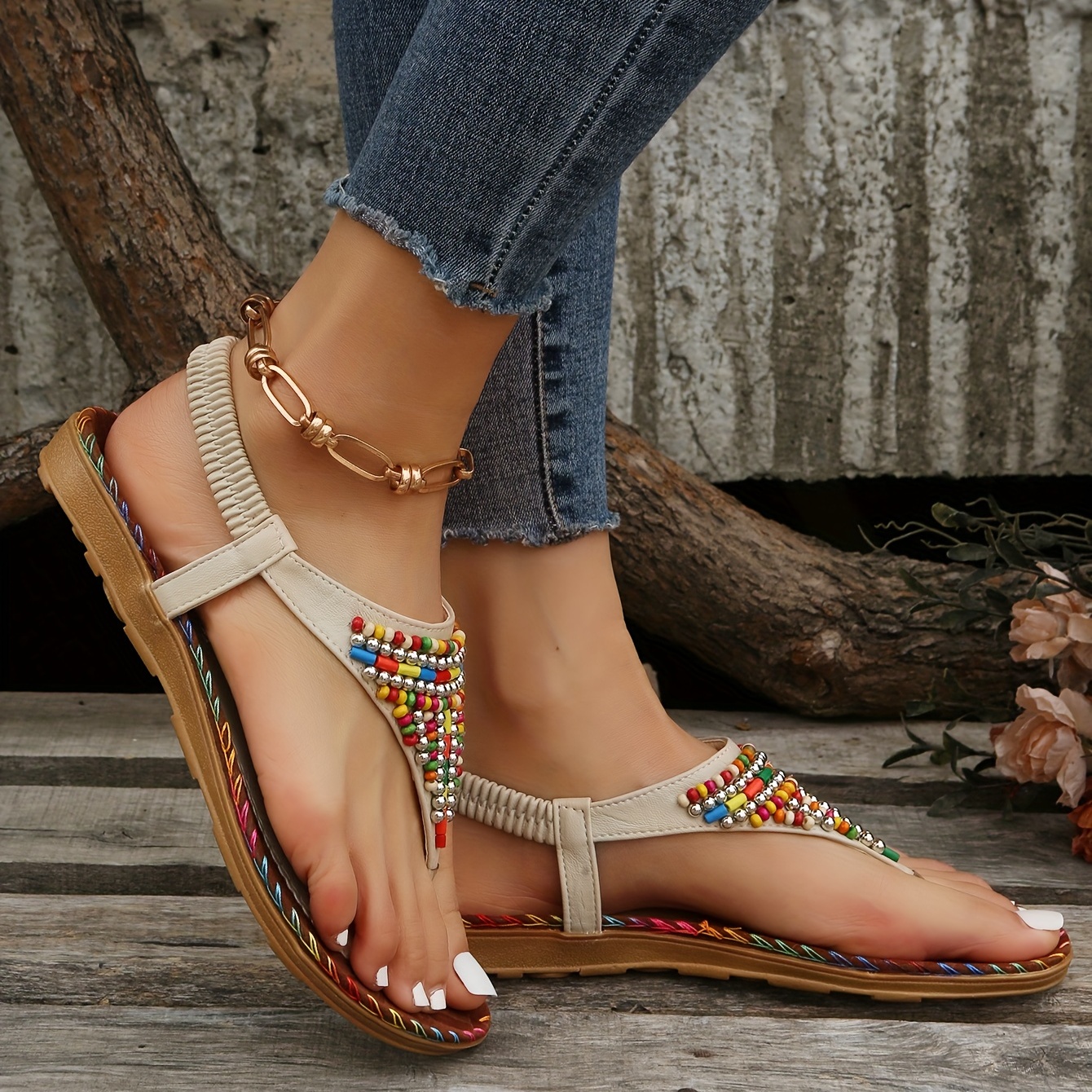 Home Women's Flat Sandals Boho Style Flat Thong Sandals, Colorful Beads Elastic Strap Slip On Shoes, Women’s Casual Sandals