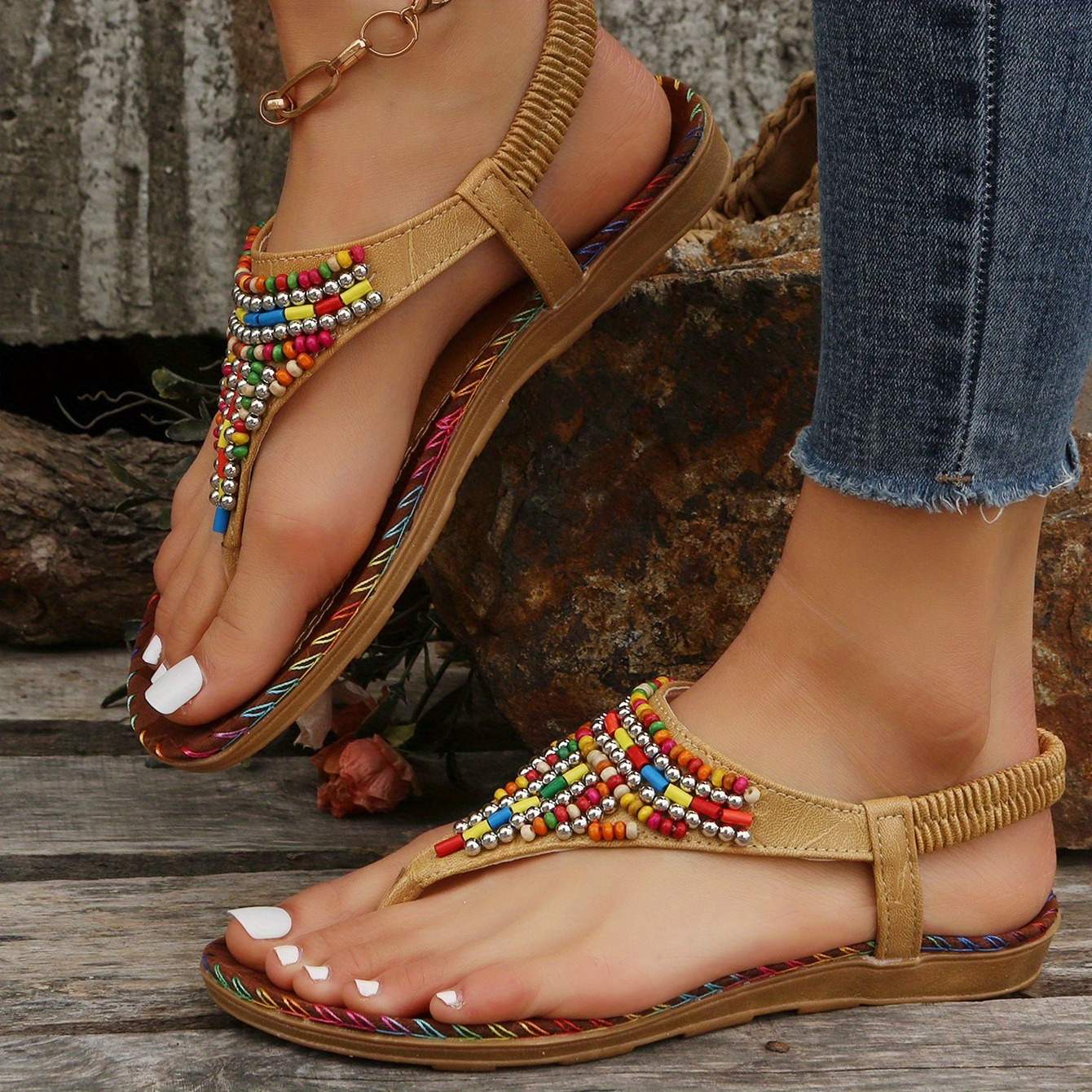 5 reviews for Boho Style Flat Thong Sandals, Colorful Beads Elastic Strap Slip On Shoes, Women’s Casual Sandals