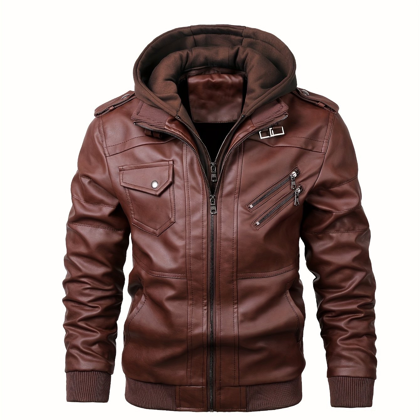 6 reviews for Men’s Casual PU Leather Jacket, Chic Zip Up Hooded Biker Jacket